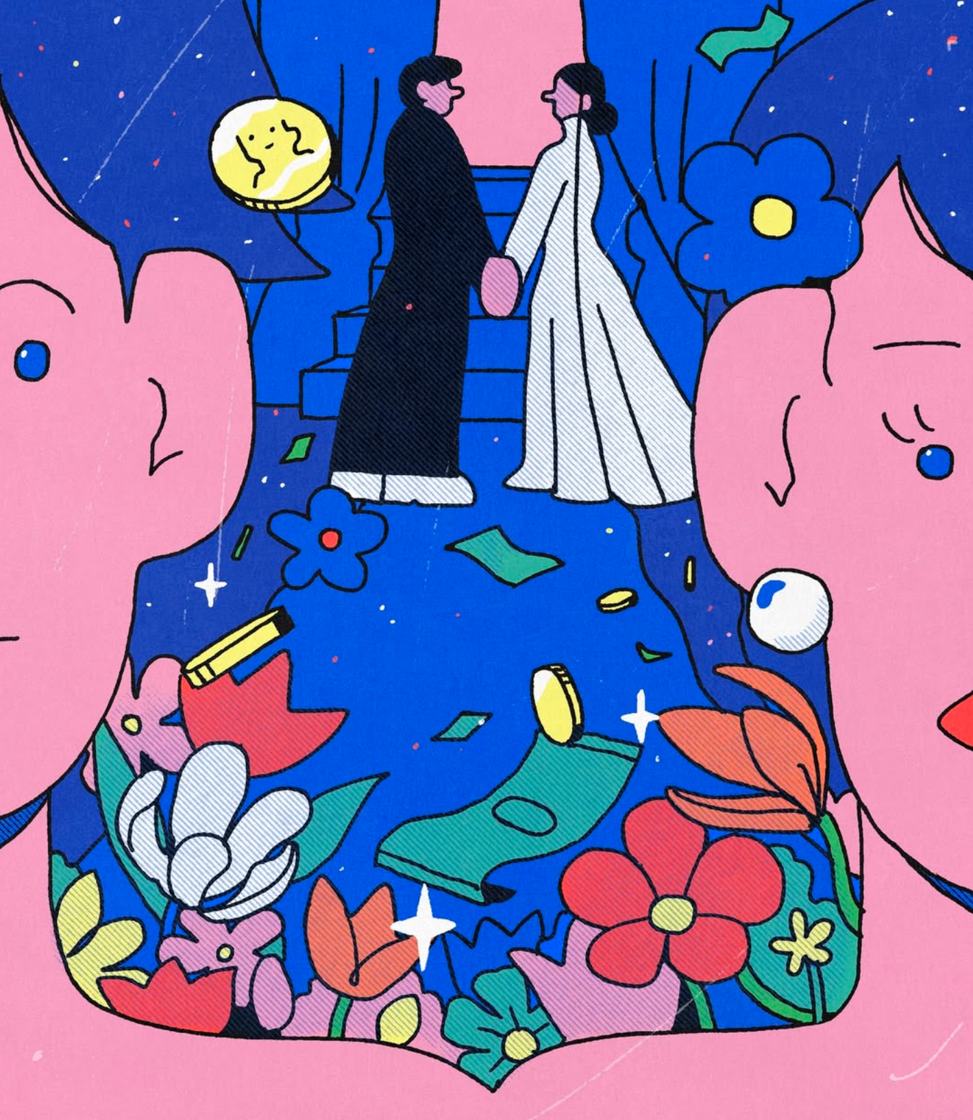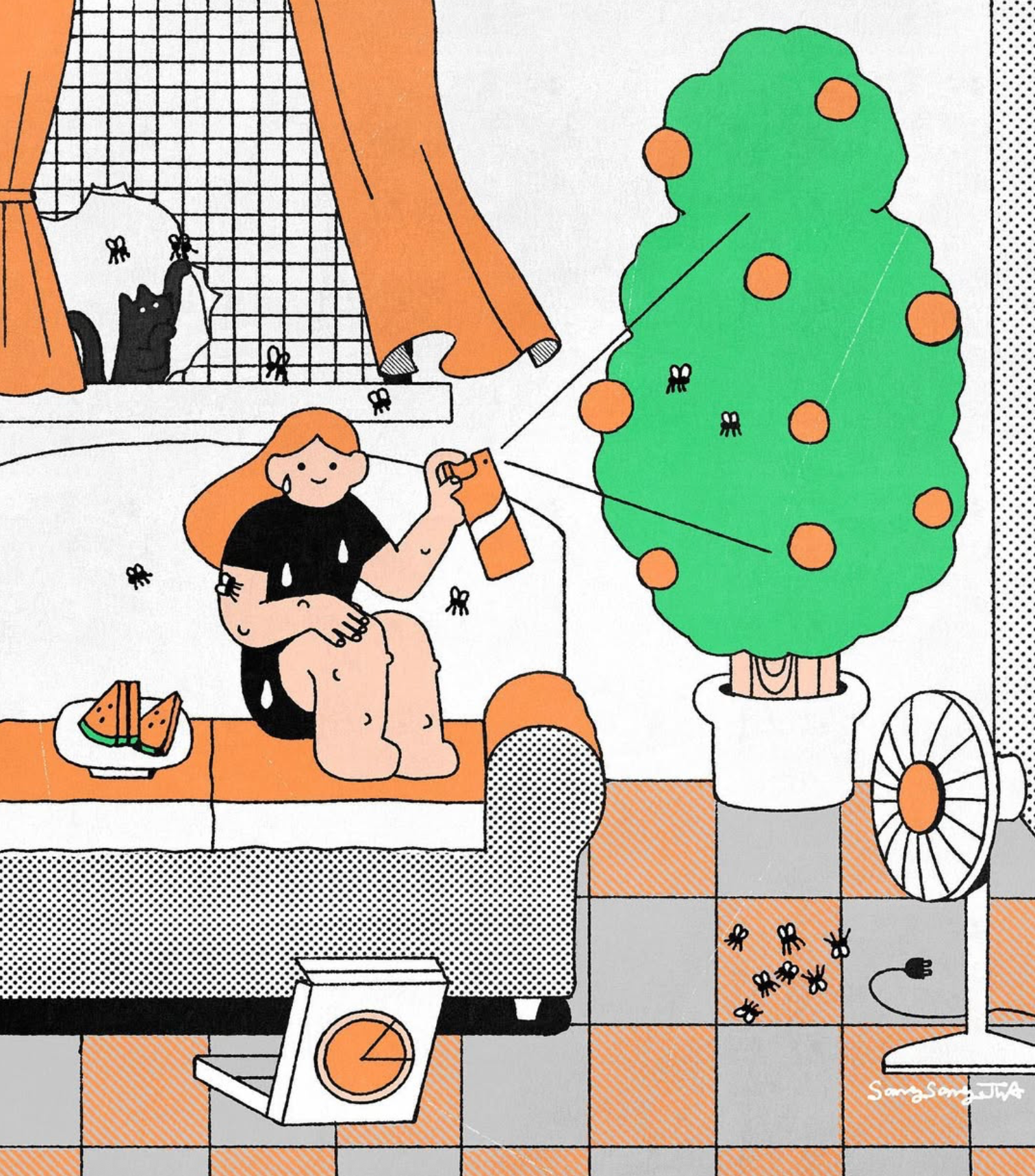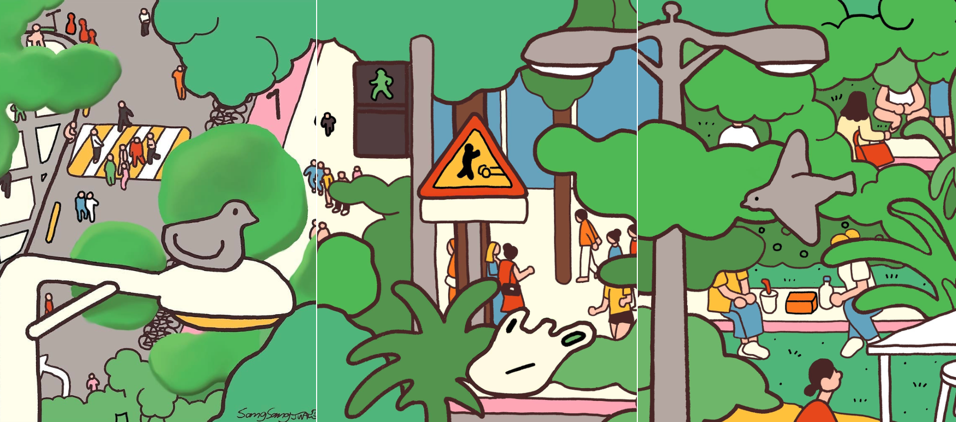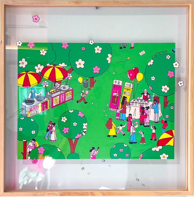 삶에서 한 발자국 멀리서 바라본 우리의 모습은 흡사 개미와 같습니다.멀리서 바라본 사람들은 헤어스타일, 어떤 옷을 입었는지, 무슨 명품을 매고 있는지, 그 사람의 권위와 명예 등 특징이 보이지 않습니다. 우리 모두  함께 살아가는 이 시간 속에서 누구에게나 ‘결핍과 고통’ 이 있으며, 멀리서 바라보면 누구나 ‘공평’ 하다는 것을 보여주고자 합니다. 캔버스 안의 작은 사람들이 사는 세상에는 어떠한 편견도 없고, 오히려 각자의 아픔과 결핍이 재미를 발휘하여 그림에서 더 빛을 낼 수 있는 이야기가 될 수 있음을 시각적으로 표현하였습니다.
